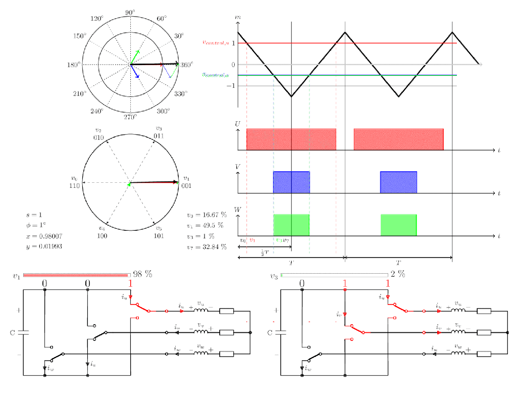 Animasyonun sıfır vektörle başlayıp bittiği ve her geçiş arasında yalnızca bir anahtarın değiştirildiği görülebilir. Bu, motorda aşırı ısınmaya ve tork dalgalanmalarına neden olan harmonikleri büyük ölçüde azaltır. Ayrıca, torka katkıda bulunmayan veya gerekli manyetik alanı korumak için gerekli olan herhangi bir akım da istenmez. Bunun nedeni, güç elektroniği bileşenlerindeki kayıpların akıma bağlı olması ve soğutma sistemini zorlayacak şekilde ısıya dönüşmesidir. Transistörlerin ve diyotların aşırı ısınması, günümüzde güç elektroniği tasarlanırken karşılaşılan temel zorluklardan biridir. Alternatif, daha yüksek akım oranlarına sahip bir dönüştürücü tasarlamaktır, ancak bu fiyatı artırır.